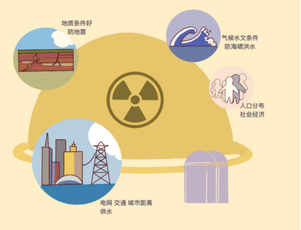 核电厂选址需要考虑区域能源需求、安全可靠性、环境相容性和经济合理性等综合因素,包括地震地质、气象、水文、危险源、交通、人口以及拟建核电厂对植物群、动物群等当地生态系统所产生的影响。具体来说,需满足稳定的地震地质结构、适宜的气象环境、适合的水文条件、与危险源保持安全距离、远离人口聚集中心、周边便捷的交通等基本条件。
