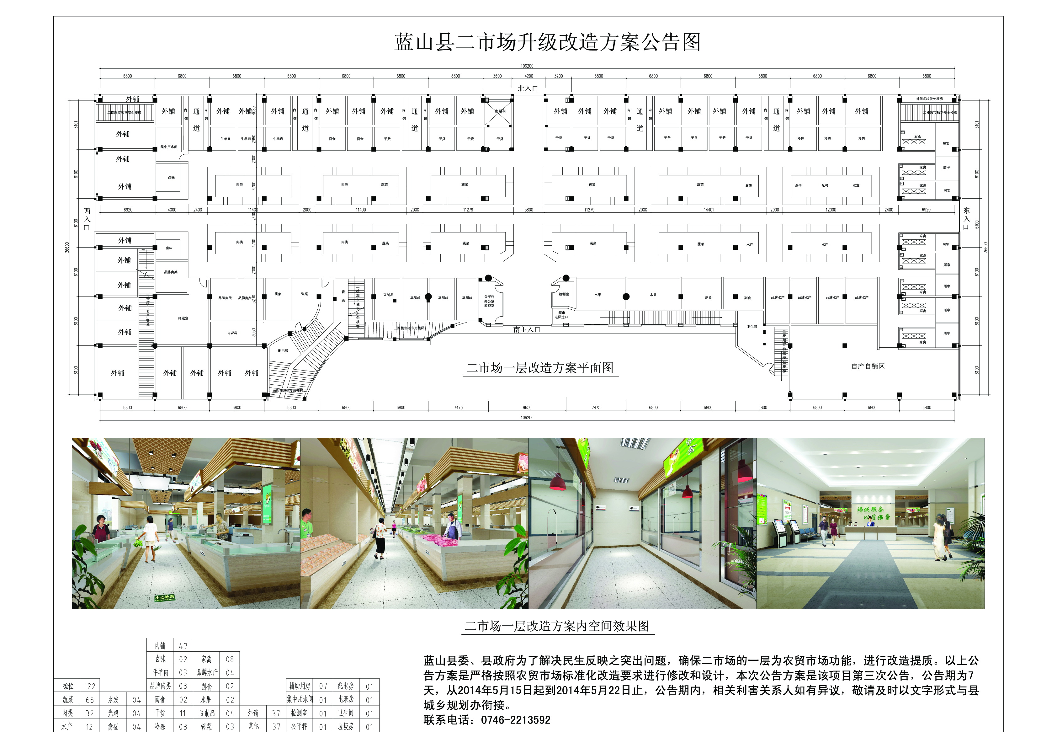 蓝山县委、县政府为了解决民生反映之突出问题,确保二市场的一层为农贸市场功能,进行改造提质。公告方案是严格按照农贸市场标准化改造要求进行修改和设计,本次公告方案是该项目第三次公告,公告期为7天,从2014年5月15日起到2014年5月22日止,公告期内,相关利害关系人如有异议,敬请及时以文字形式与县城乡规划办衔接。