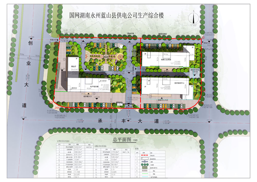 国网湖南永州蓝山县供电公司生产综合楼位于蓝山县创业大道交承丰大道处东北角,地块总用地面积为13333.00㎡(约20亩);建筑总占地面积2365.34㎡;总建筑面积为21173.11㎡,其中地下室面积2652.03㎡(不计容);容积率为1.39,建筑密度为17.74%,绿地率为30.05%,停车位119个。一期规划用地面积为7779.26㎡,总建筑面积为5600.00㎡。二期规划用地面积为5553.74㎡,建筑面积为15573.11㎡。