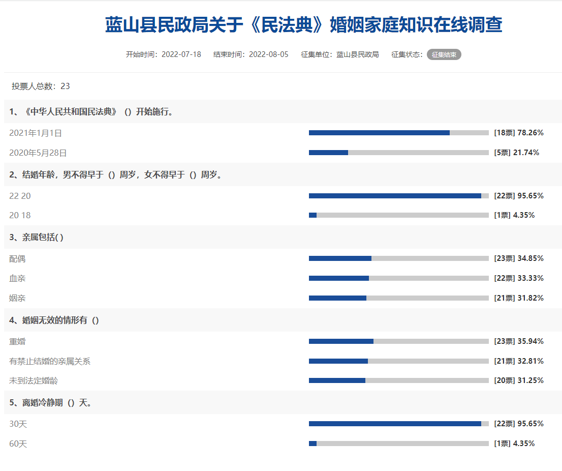 蓝山县民政局于2022-XX-XX 到 2022年7月18日在蓝山县人民政府网站开展了“《民法典》婚姻家庭知识在线调查”活动。截至活动结束,有23人参与调查(调查结果见下图)。下一步,我局将继续开展《民法典》婚姻家庭知识以及政策宣传活动,欢迎广大市民给我们提供更多更好的意见建议。