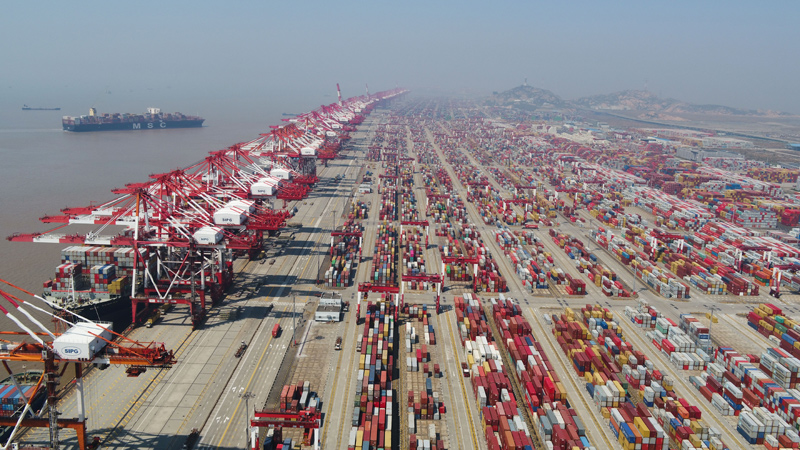 这是2020年3月18日拍摄的上海洋山港集装箱码头(无人机照片)。新华社记者 丁汀 摄