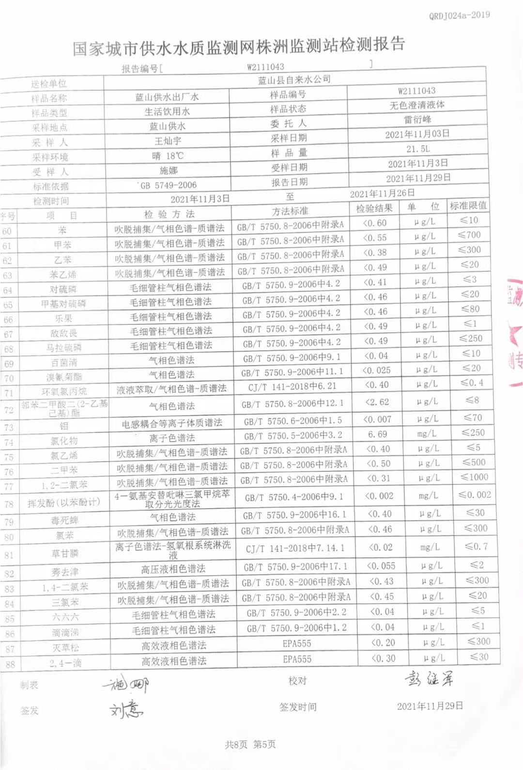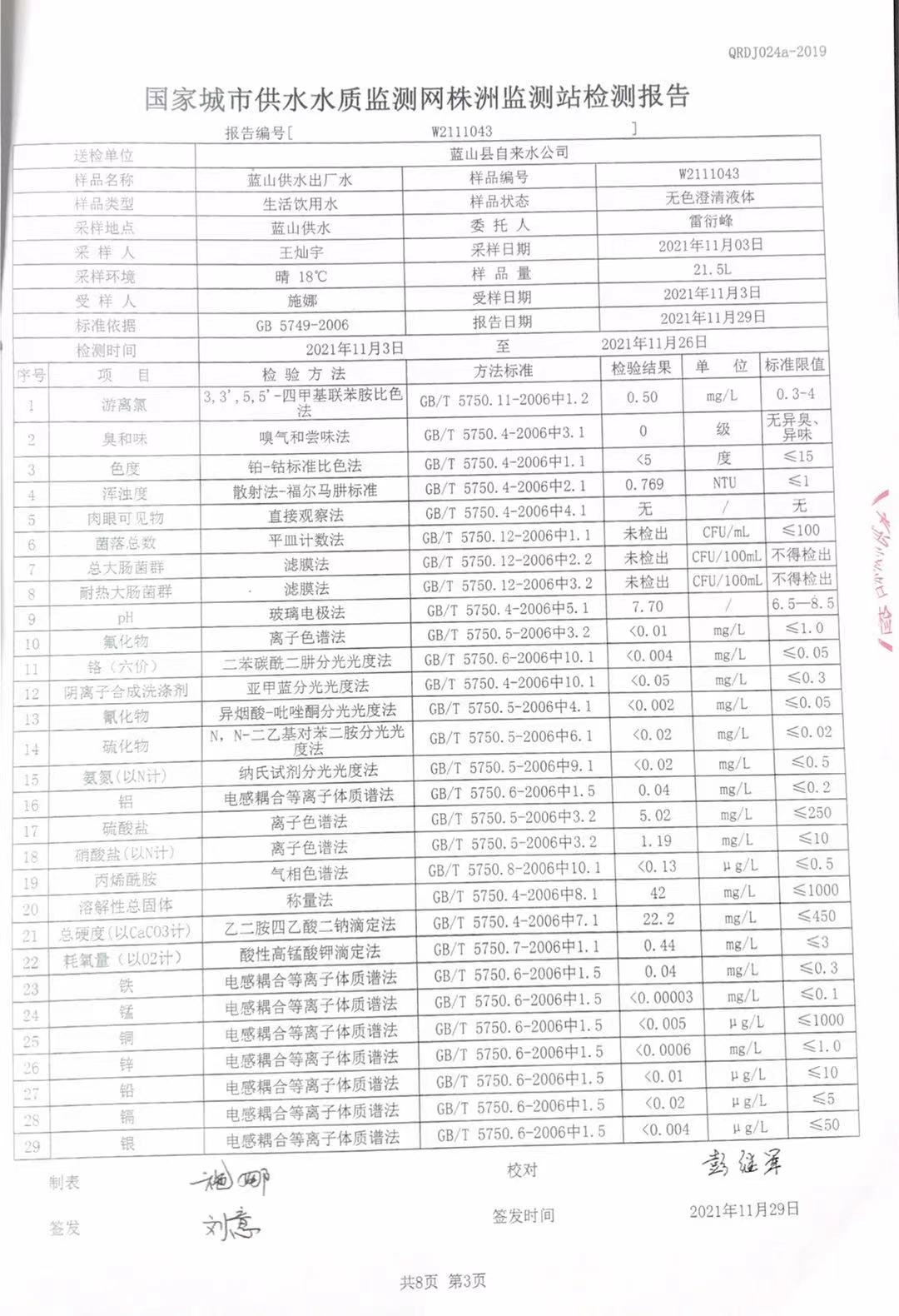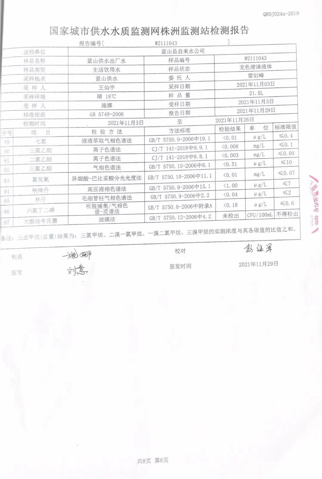 2021年11月份蓝山县供水出厂水水质监测结果公示