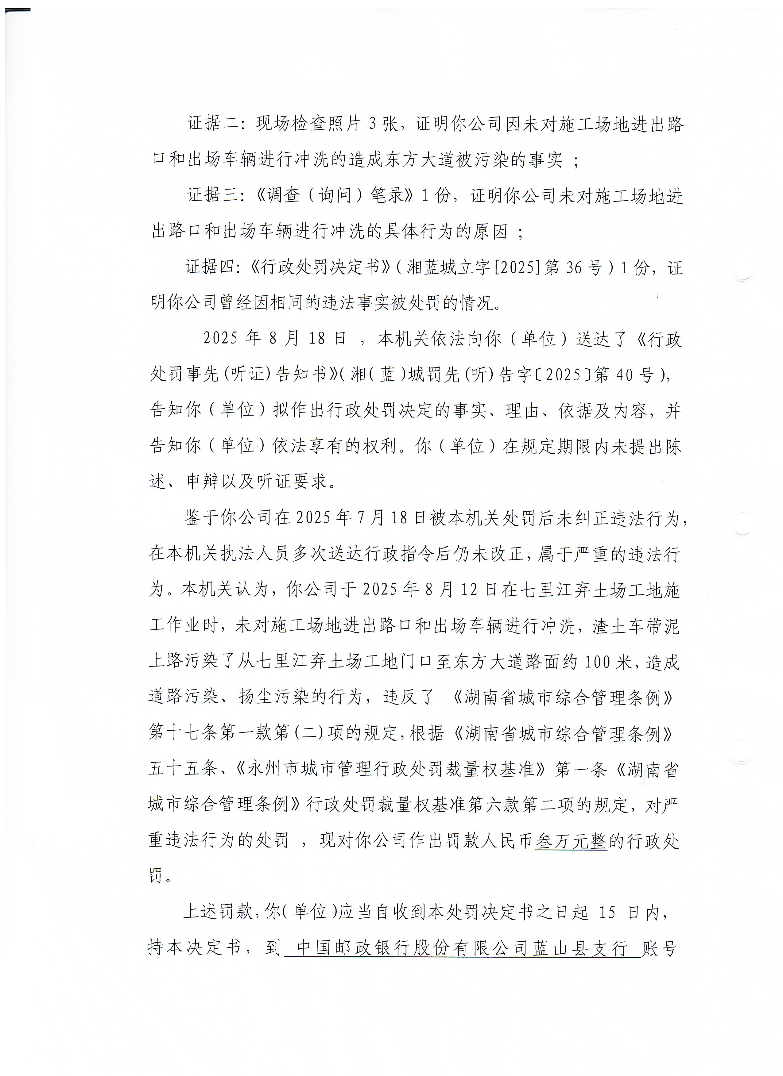 关于对蓝山县城投环保建材有限公司未对施工场地进出路口和出场车辆进行冲洗行为的处罚