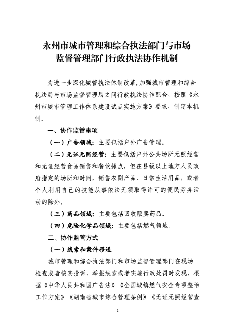 名称: 关于印发《永州市城市管理和综合执法部门与市场监督管理部门行政执法协作机制》的通知