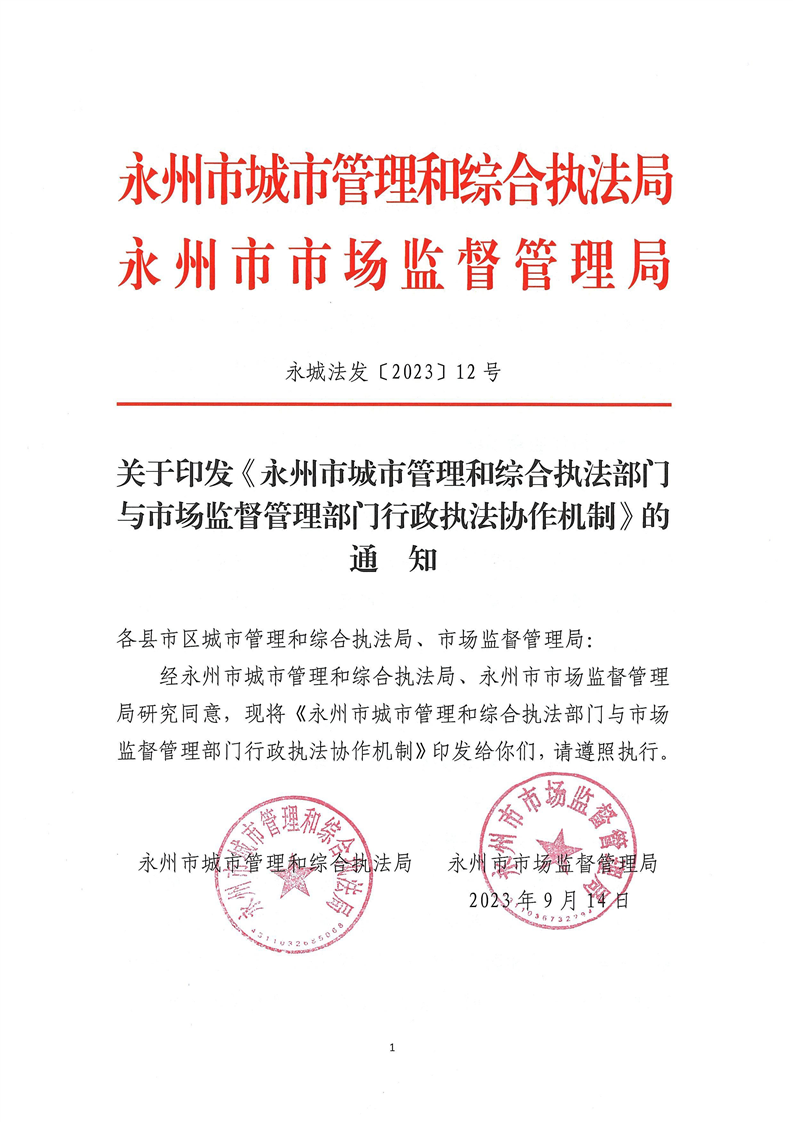 关于印发《永州市城市管理和综合执法部门与市场监督管理部门行政执法协作机制》的通知