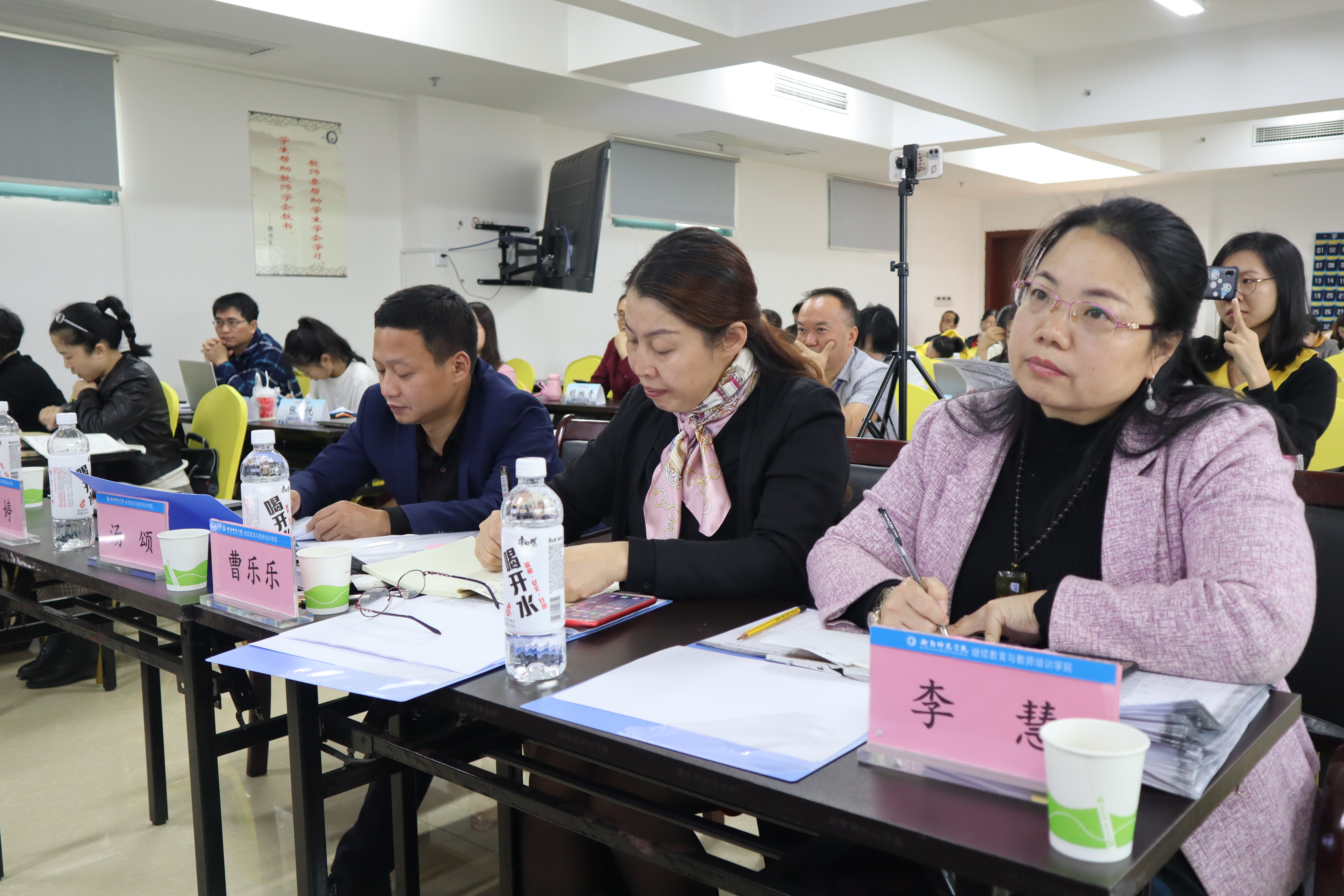 省国培专家组评委曹乐乐、汤颂、李慧一行三人在湖南省衡阳市高速铁路职业技术学院培训中心对来自全省 11个市的71名初中语文教师进行考评,省国培办巡查组刘婷出席考评活动现场督察指导工作,衡阳师范学院相关项目负责人全程陪同考核。