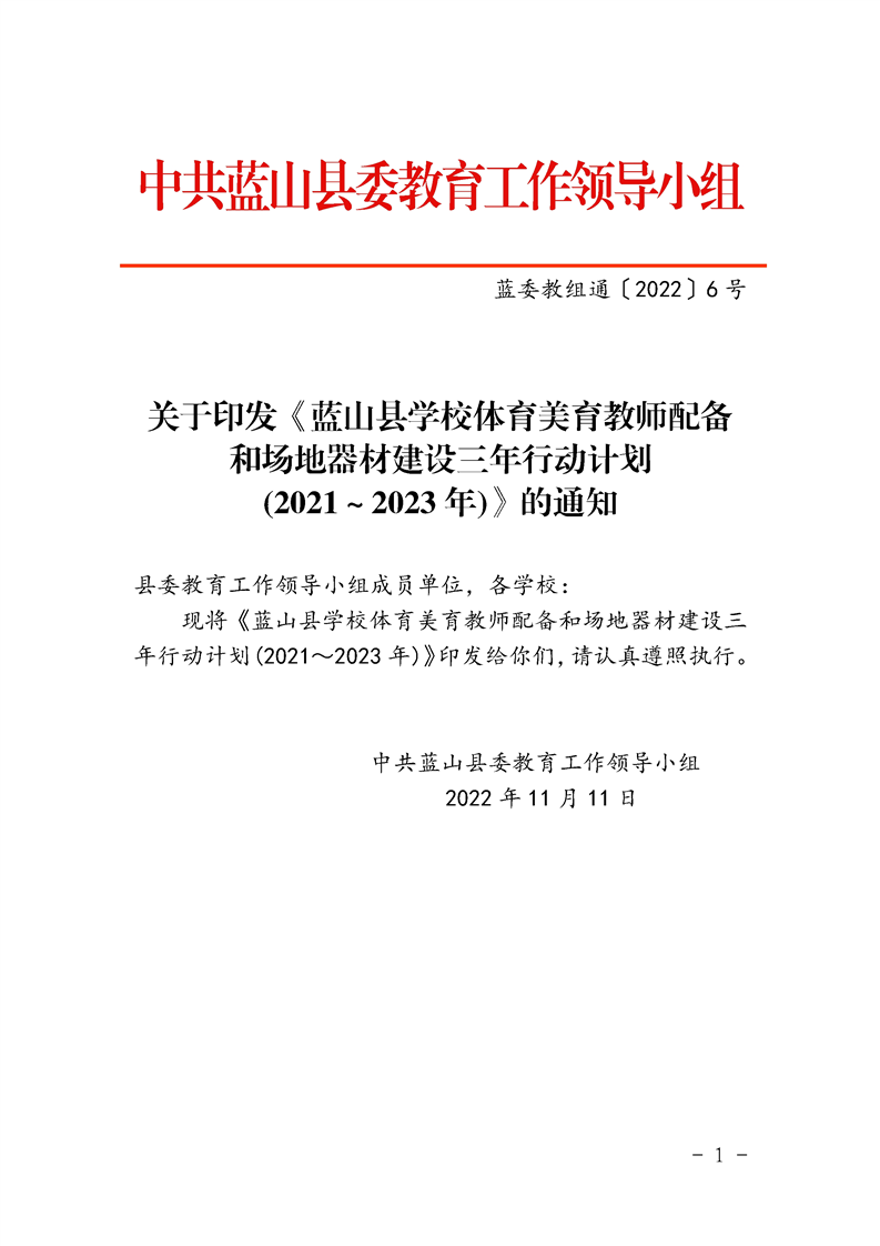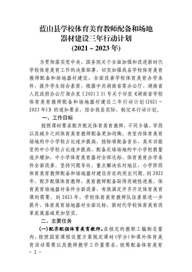 关于印发《蓝山县学校体育美育教师配备和场地器材建设三年行动计划(2021~2023年)》的通知
