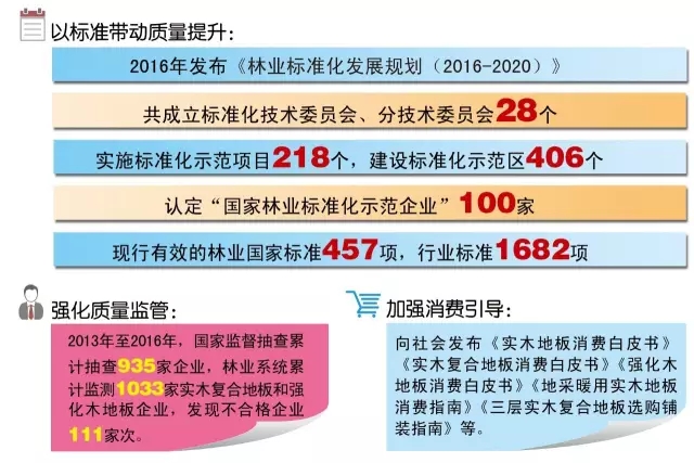关于林产品的质量提升,主要从5个方面发力,取得了一定成效。一是开展标准研制,引领质量提升。去年,国家林业局发布了《林业标准化发展规划(2016-2020)》,建立了林业标准体系。积极推进林业标准的制修订工作,开展了林业标准化示范工作,截至2016年底,先后成立标准化技术委员会、分技术委员会28个。到目前为止,现行有效的林业国家标准457项,行业标准1682项,基本覆盖林业生产建设的全过程全领域。实施标准化示范项目218个,建设标准化示范区406个。和国家标准委联合,认定了“国家林业标准化示范企业”100家。国家林业局每年还分别召开一次关于质量监测和标准化工作的培训会议。