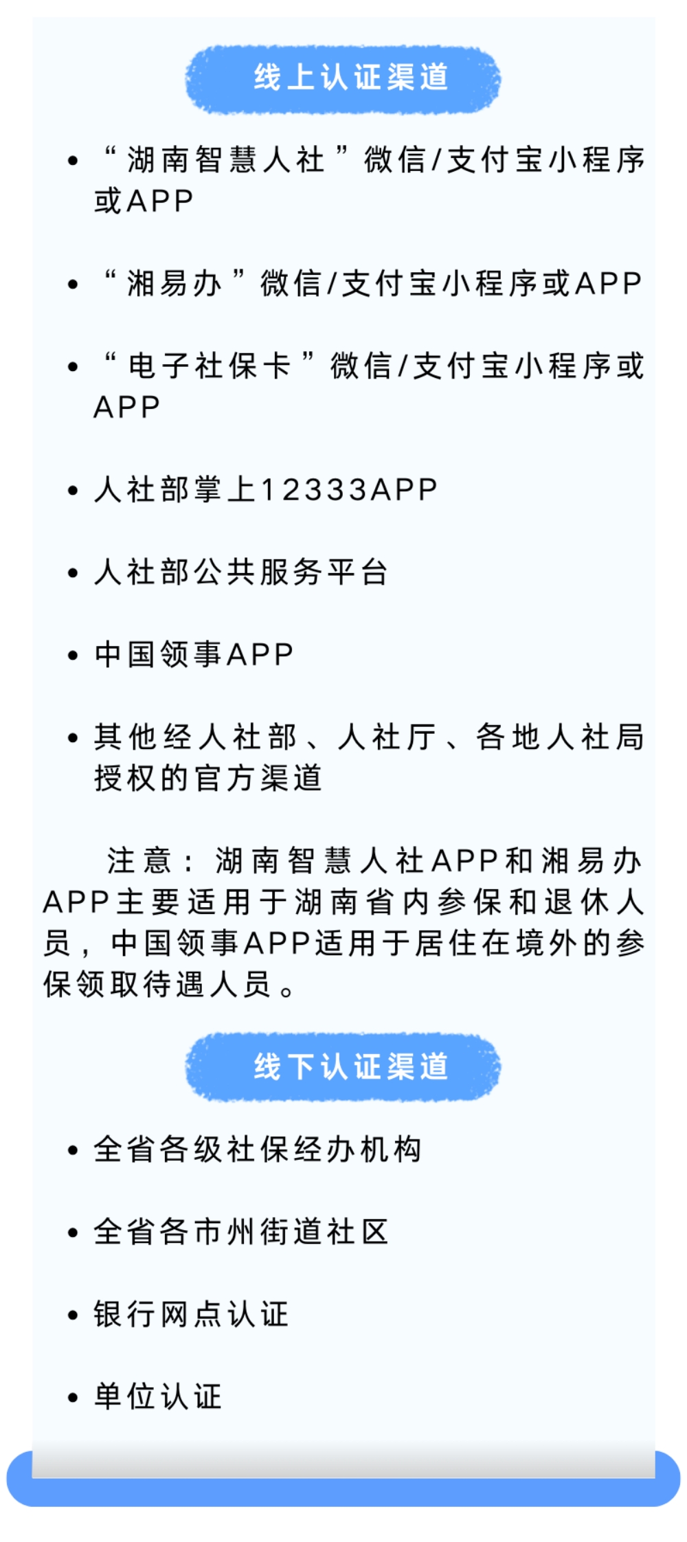 参保人每年至少进行一次待遇领取资格认证,可通过湖南省人力资源社会保障厅门户网或“湖南智慧人社”微信/支付宝小程序或APP等(具体认证渠道附后),进行待遇领取资格自助认证;也可到乡镇(街道)基层社保服务窗口现场进行资格认证。