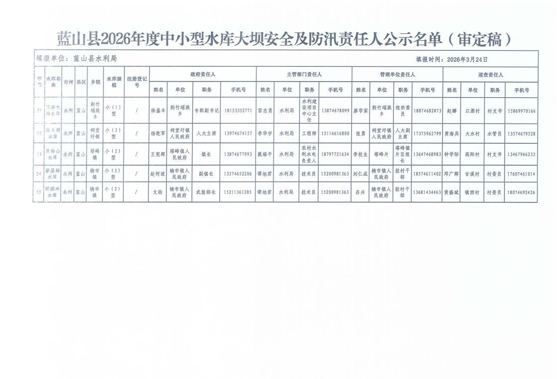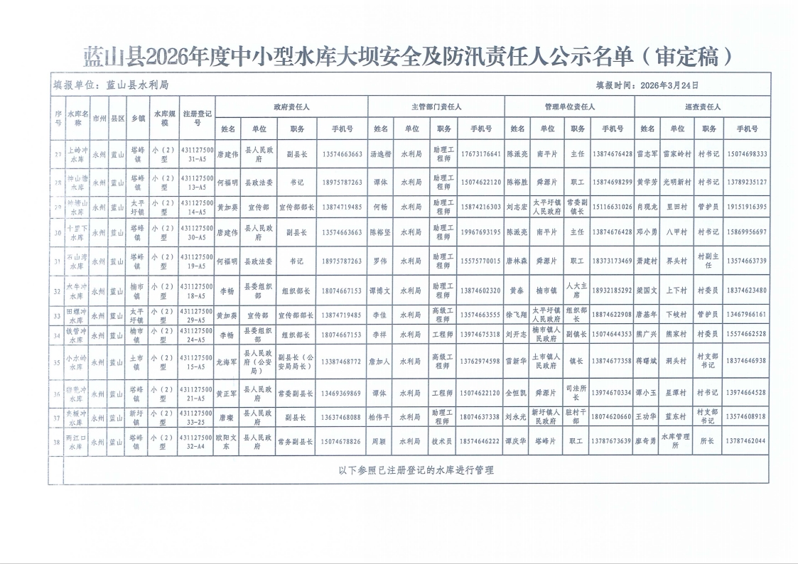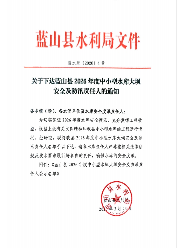 关于下达蓝山县2026年度中小型水库大坝安全及防汛责任人的通知