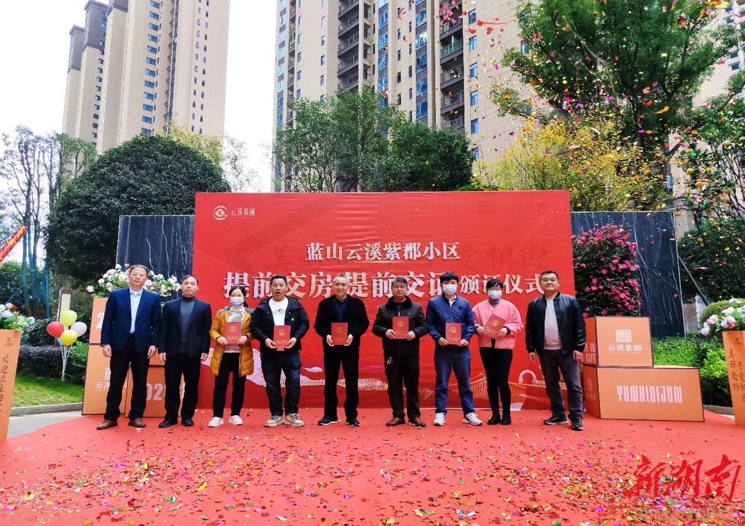 近日,蓝山县云溪紫郡项目商品房“提前交房、交房即交证”颁证仪式举行,县自然资源局、行政审批服务局等审批部门负责人为现场首批拿证的购房代表发证。