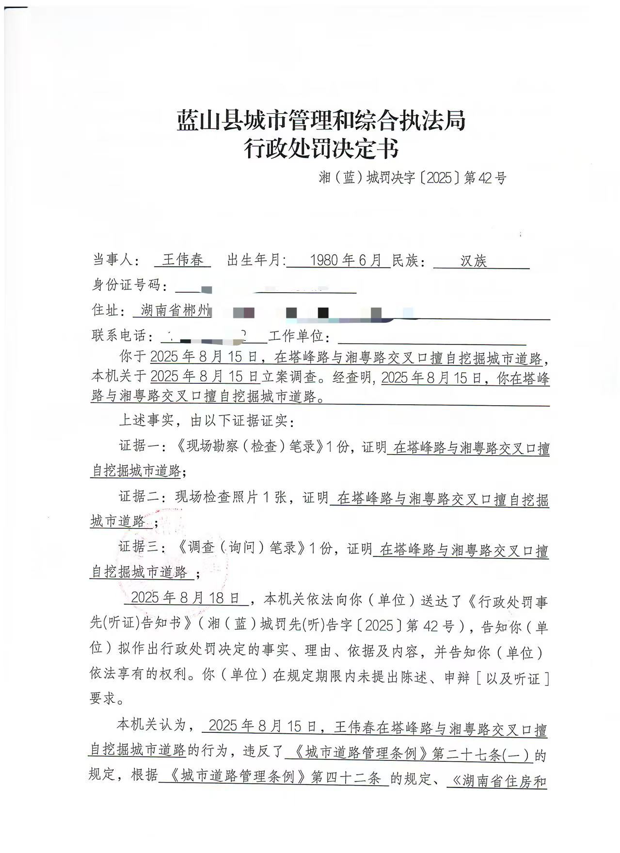 关于对王伟春在塔峰路与湘粤路交叉口擅自挖掘城市道路行为的处罚