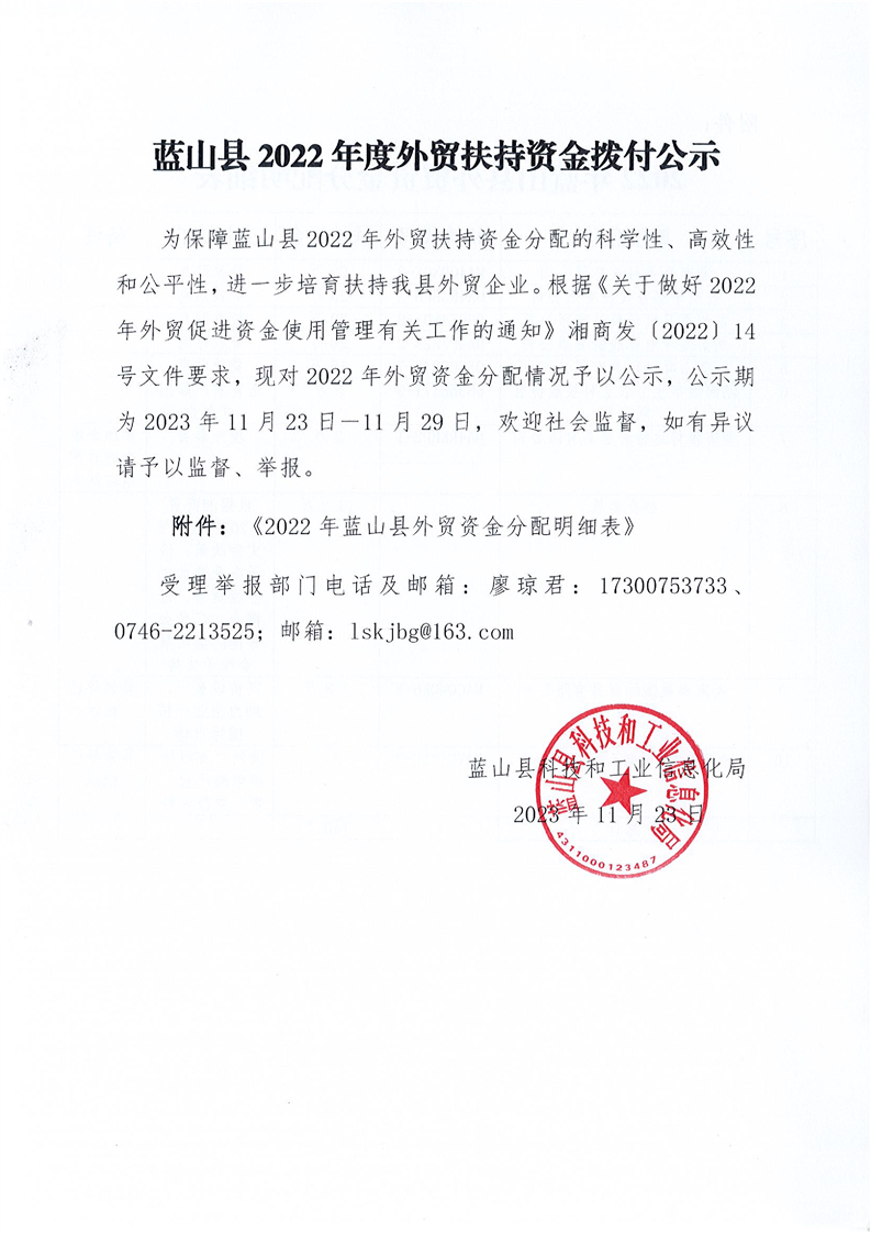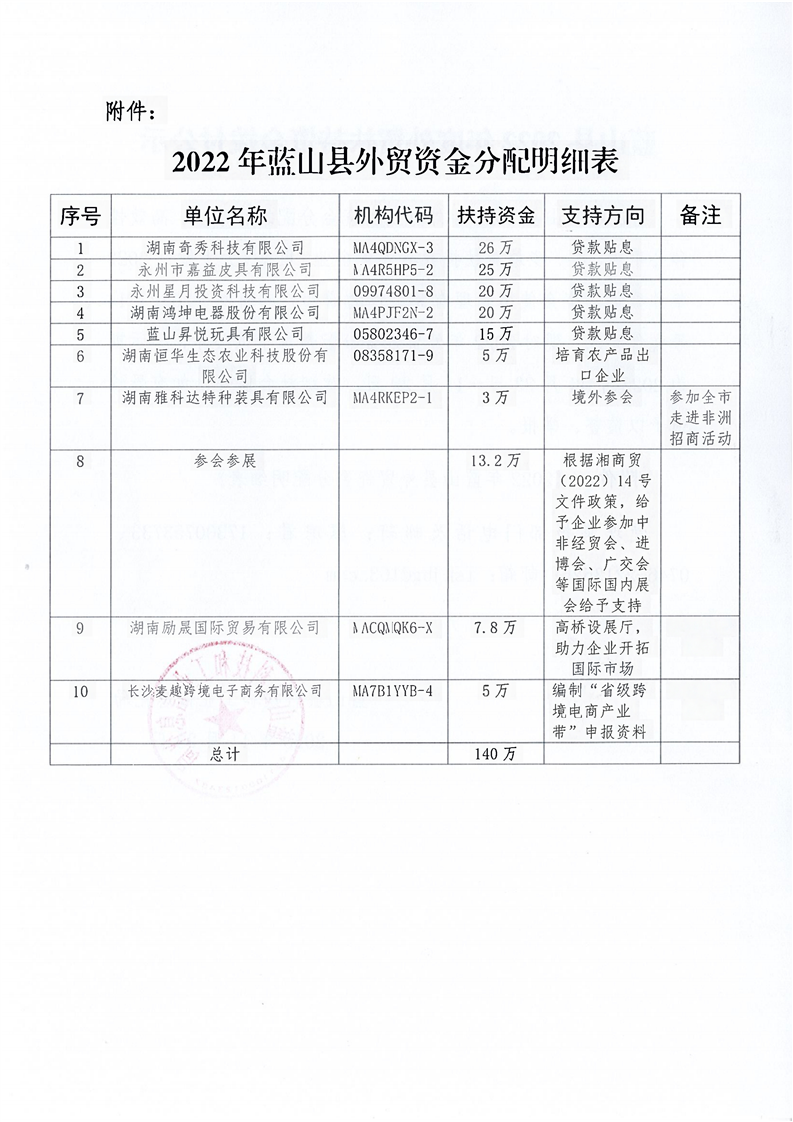 蓝山县2022年度外贸扶持资金拨付公示