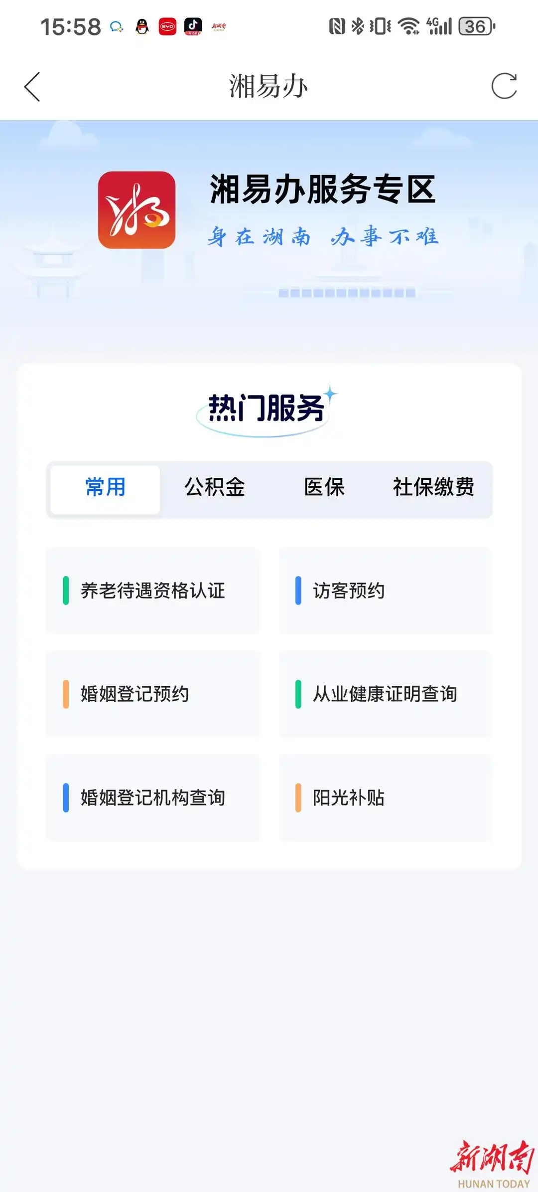 打开新湖南客户端,在首页新闻模块或者服务模块,即可点击进入“湘易办”服务专区。目前,专区已首批集成社保医保查询、公积金查询、养老服务、婚姻登记预约、阳光补贴等21项高频政务服务。用户使用已有“湘易办”账号一键登录后,无需跳转,即可完成查询、办理、进度追踪全流程操作。无论是预约前往政府部门办事,还是查看医保消费记录,如今在浏览新闻的间隙,动动手指就能轻松搞定。