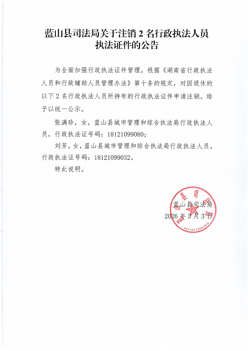 蓝山县司法局关于注销2名行政执法人员执法证件的公告