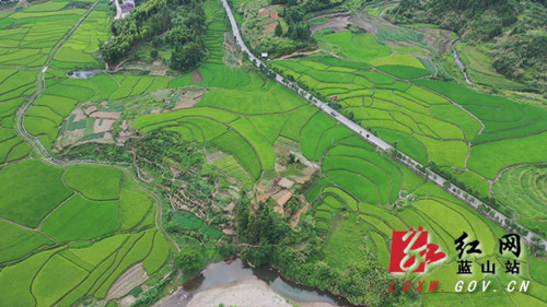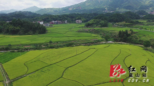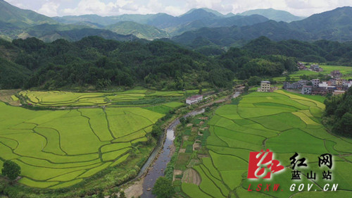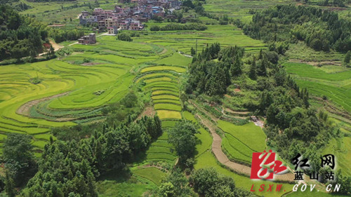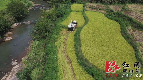 红网蓝山县分站8月19日讯(通讯员 孟江兵 王欣金 )8月中下旬,我县各山区乡镇梯田里种植的一季稻普遍进入抽穗扬花期,也有少部分早中稻渐渐转黄,山风吹过,一望无垠的高山梯田里或碧波荡漾,或扬起层层金黄稻浪,层层叠叠的稻浪把一座座小山村装点得美不胜收。 在所城镇和大桥瑶族乡一带,村民们依山势开垦出一垄垄田块,层层叠叠向山坡延伸。从高空俯瞰,高山梯田线条粗犷,犹如绸带,又似弯月。墨绿的、淡绿的、淡黄色、金黄的,生长周期不同的水稻瞬间把大地染成了一块多彩调色板,宛如把每一叠梯田勾勒成天上瑶池,又似人间仙境。收割机在一丘丘金色稻浪中来回穿梭,弹奏出一首首欢快的梯田欢歌。在蓝天白云映照下,各色翻滚的稻浪与静谧的小山村组成了一幅幅迷人画卷。