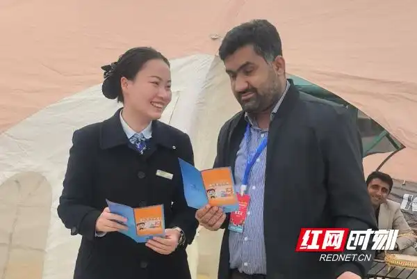 “您好,这是金融安全的宣传册。”看到一位抱着皮质公文包的外籍采购商路过,工作人员立刻递上中英双语金融知识宣传册,还指着“跨境转账核实要点”那页放慢语速:“如果您需要转账,一定要核对两遍账户哦。”客商翻了两页,举着手册开心地比了个“OK”的手势。
