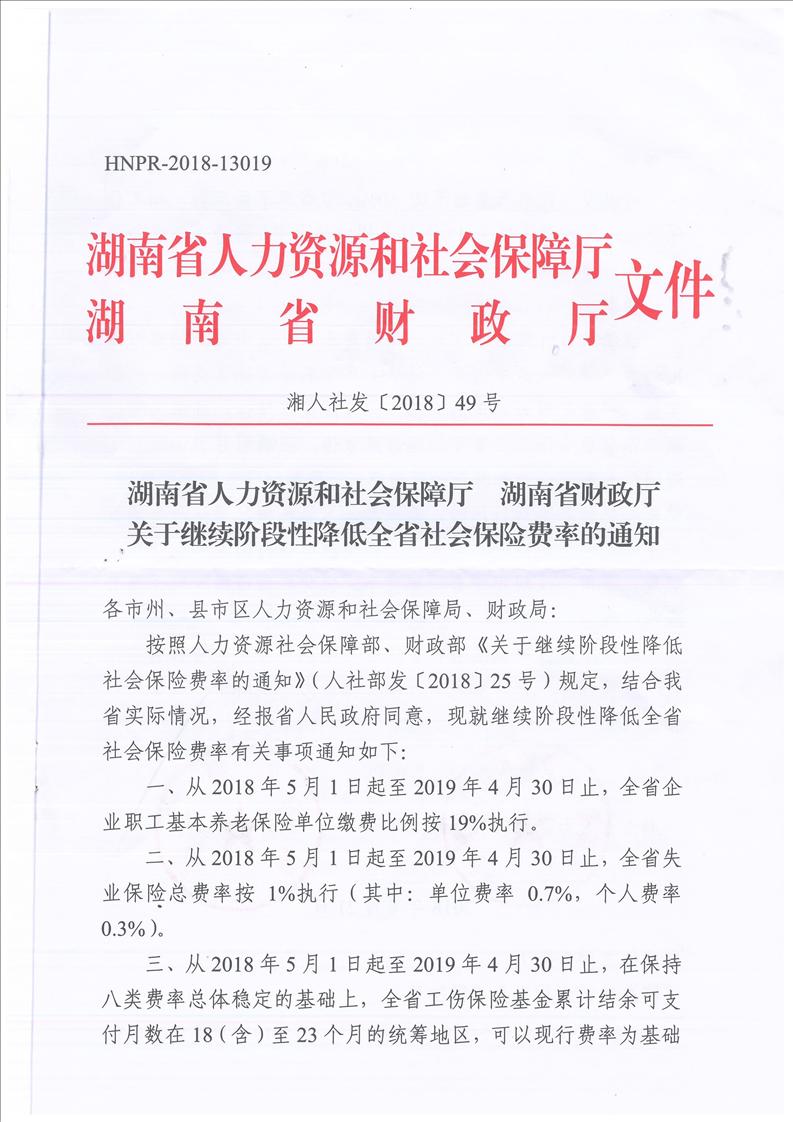 湖南省人社厅、财政厅关于继续阶段性降低全省社会保险费率的通知