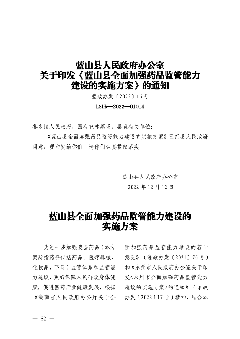 蓝山县人民政府办公室关于印发《蓝山县全面加强药品监管能力建设的实施方案》的通知
